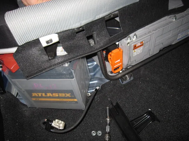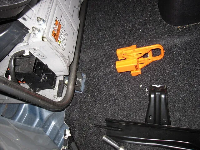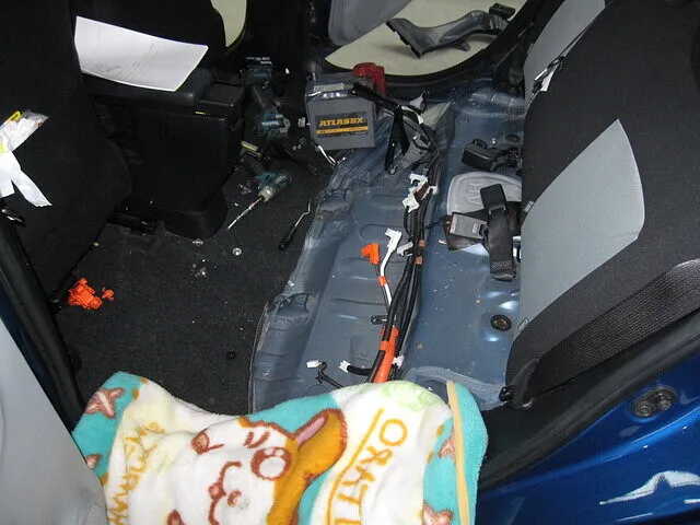 リアシート座面下にあるカバーを外して補機バッテリーとハイブリッドバッテリーのサービスプラグを抜いて10分間放置