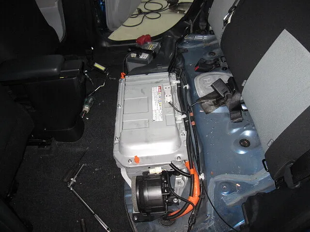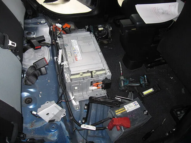 リアシート座面外して(少し硬いですが勘合部にドライバーを差し込みてこの原理で取外し)、シートフレーム取外して、数本の配線カプラーを引き抜いてハイブリッドバッテリー本体の取外し