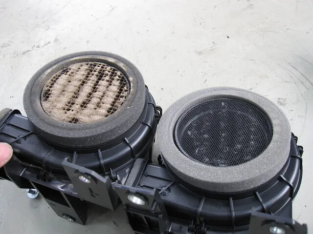 右画像はハイブリッドバッテリークーリングファンです 左143,000km 右25,700km さすが、埃の量が違います もちろん低走行の物を使います